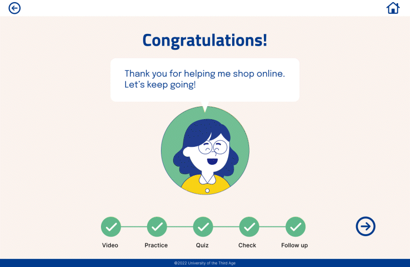 Multiple interviews with U3A members revealed the importance of creating a system of rewards to build confidence throughout their learning journey, as well as various issues related to the topic. The significance of a simple and highly visible UI was also noted.